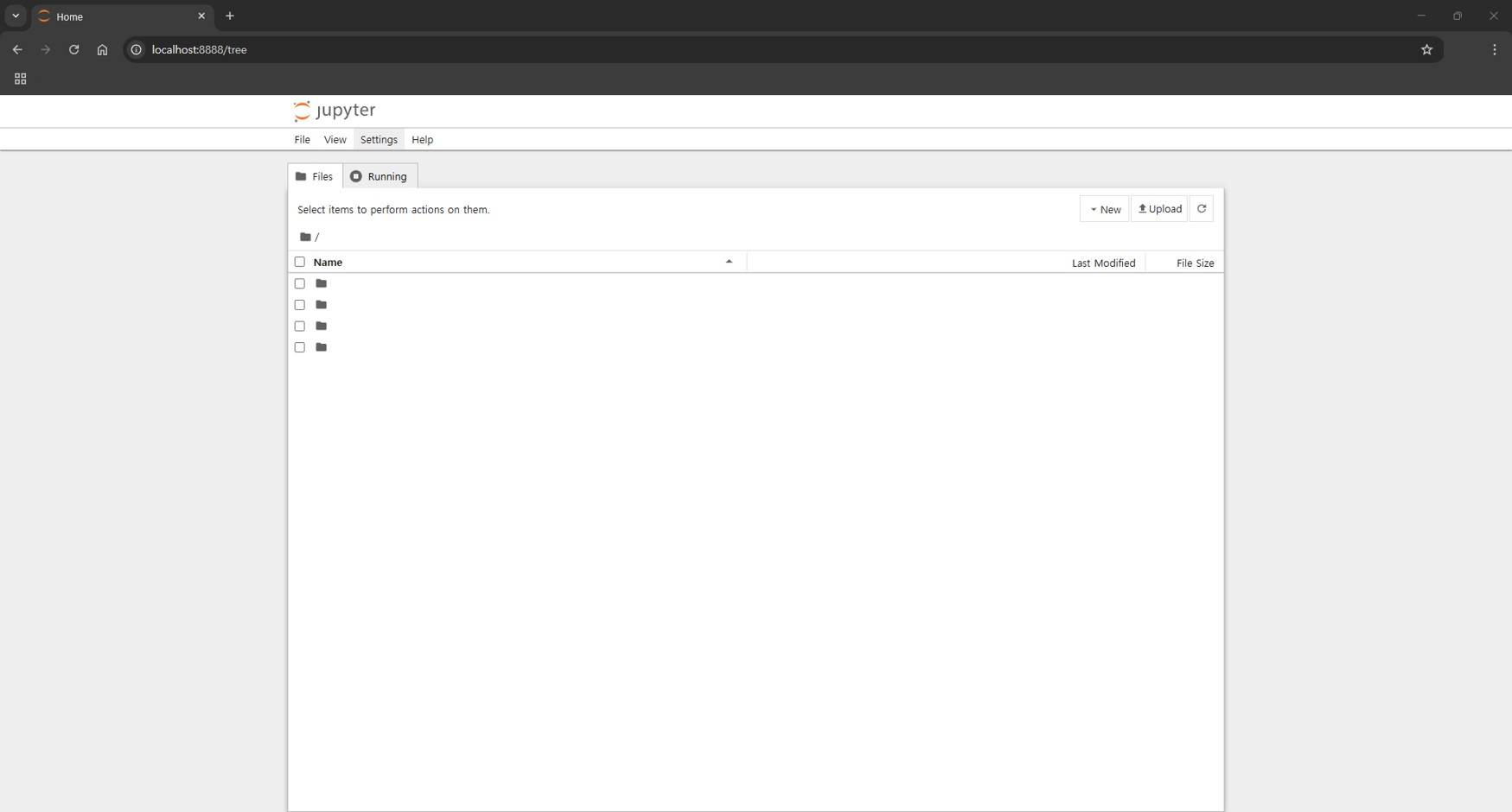 Jupyter가 실행되면 전 단계에서 설정했던 기본 경로가 나오고, New 버튼 혹은 + 버튼을 클릭하여 노트북, 콘솔, 터미널 등을 사용할 수 있습니다.