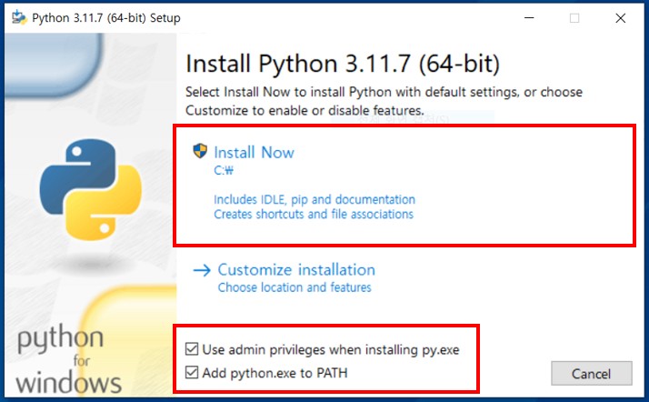 다운로드한 설치 파일을 실행하고, Add Python.exe to PATH 옵션을 체크합니다. 옵션을 체크해야 별도의 환경 변수 설정이 필요없습니다.