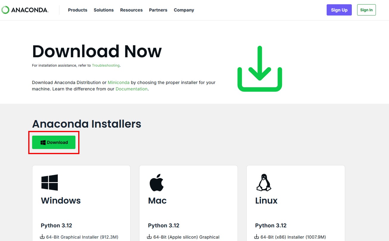 Anaconda 공식 웹사이트의 다운로드 페이지에서 OS 및 원하는 버전에 맞는 설치 파일을 다운로드합니다.