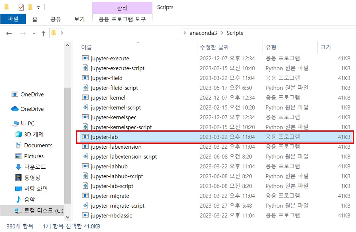 Anaconda 설치 경로에 있는 Scripts 폴더에 들어가보겠습니다.