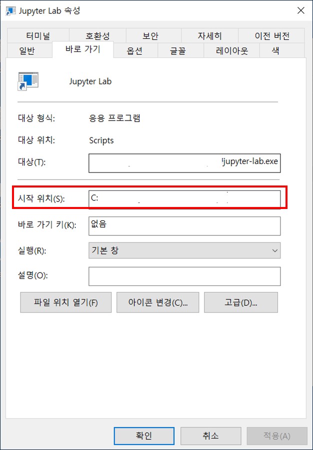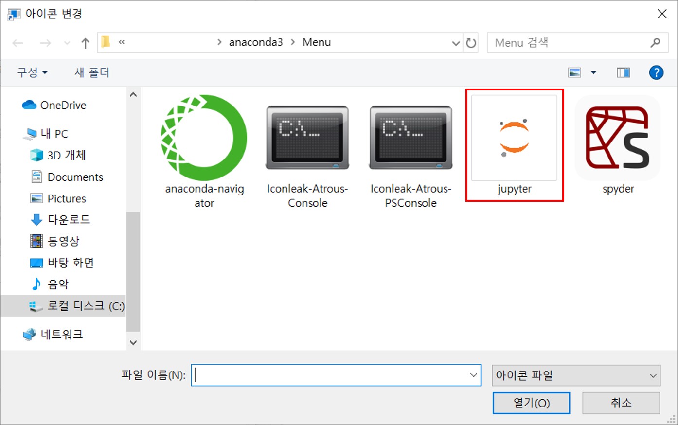 아이콘 변경 버튼을 클릭 후, Anaconda 설치 경로에 있는 Menu 폴더에 들어가 jupyter.ico을 적용해주세요.