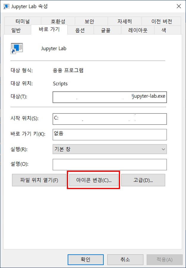 아이콘 변경 버튼을 클릭 후, Anaconda 설치 경로에 있는 Menu 폴더에 들어가 jupyter.ico을 적용해주세요.